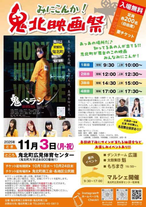 令和7年11月3日(月・祝)、鬼北町広見体育センターにて開催する映画『鬼ベラシ』上映会(みにこんか!鬼北映画祭)につきまして、現在上映会のチケットは商工会および町内各公民館で配布しておりますが、「窓口での受け取りが難しい」というお問い合わせをいただいております。