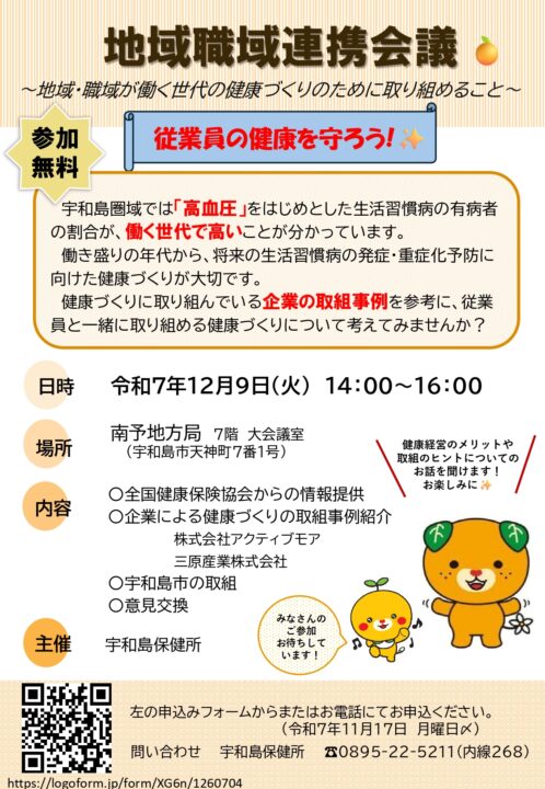 宇和島保健所では、働く世代の健康づくりをテーマにした「地域職域連携会議」を開催します。