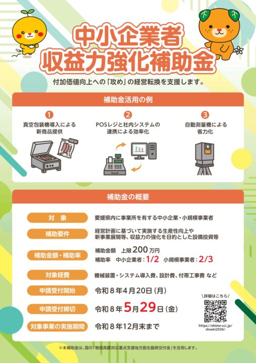 愛媛県商工会連合会では、愛媛県からの補助を受け、県内に事業所を有する中小企業・小規模事業者の生産性向上や新事業展開等を通じた収益力強化を後押しするため、標記の補助金を公募いたします。
