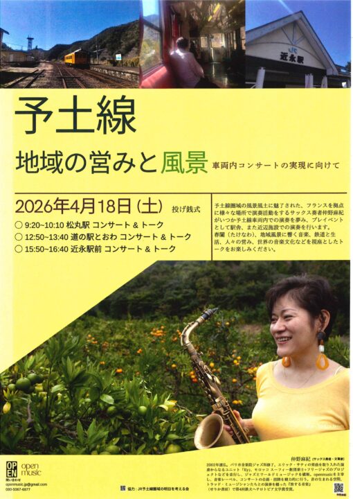 本イベントは、予土線圏域の魅力を音楽とともに発信することを目的に、フランスを拠点に活動するサックス奏者・仲野麻紀氏を迎え、各会場にてコンサートとトークが行われるものです。鉄道や地域文化、人々の暮らしをテーマにした内容となっており、地域の新たな魅力に触れる機会となっています。